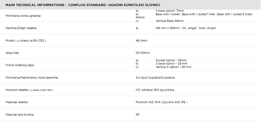 Peštan公司其Confluo標(biāo)準(zhǔn) - 在1種尺寸(194 X194毫米),2種不同的網(wǎng)格設(shè)計(jì)(不銹鋼“角度”黃金“角度”),4個(gè)不同的堿基(水平,帶1個(gè)輸出的基礎(chǔ)上,其基極產(chǎn)生的角浴室地漏是水40毫米的止動(dòng)件,其基極為30mm與水性塞子,垂直基)和2種不同的模式虹吸(在虹吸就是DB,所述杯形密封件)。所有基地Confluo標(biāo)準(zhǔn)模型具有DN與高達(dá)48升/分鐘的流量輸出50毫米。從74毫米最低高度毫米到95毫米視型號(hào)而定。