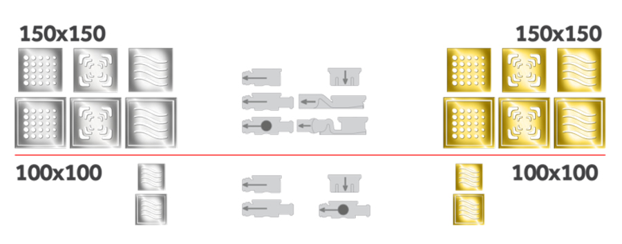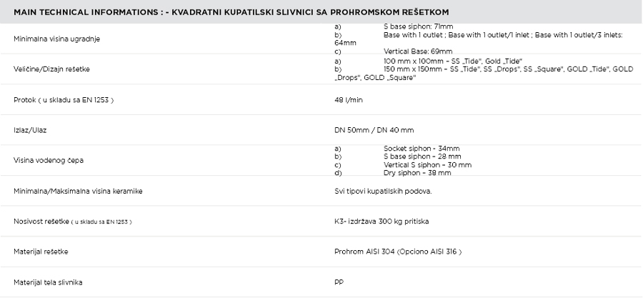 Peštan公司及其Confluo標(biāo)衛(wèi)浴在2種不同尺寸(100毫米x 100在100mm和150毫米×150毫米),6個(gè)不同的設(shè)計(jì)光柵可水渠(Prohrom“潮”不銹鋼“滴”不銹鋼“廣場”金“潮”黃金“滴“金”廣場“),6種不同的堿(水平基座1個(gè)輸出,與1點(diǎn)的輸入/輸出1水平基部,水平基座3的輸入/輸出1,其基為40mm水柱,其基極用30mM水溶液螺柱,垂直堿)和3種不同類型虹吸(在-S為主虹吸,干虹吸管虹吸杯)的。所有基地Confluo標(biāo)準(zhǔn)模型具有DN和DN輸出50毫米40毫米與高達(dá)48升/分鐘的流速進(jìn)入。從74毫米最低高度毫米到95毫米視型號而定。